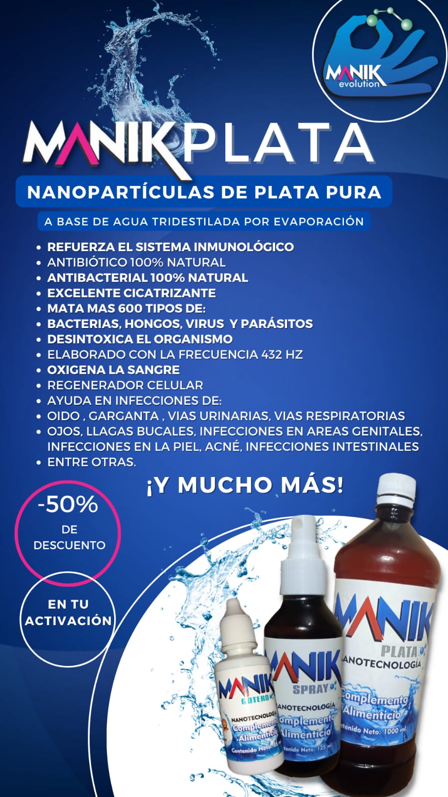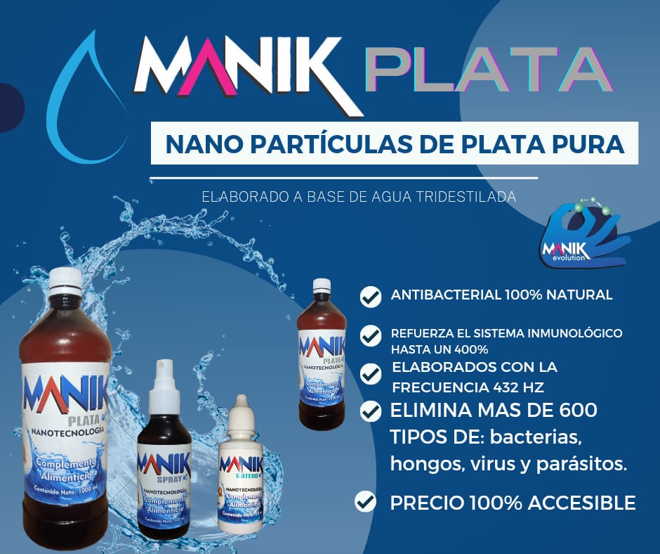 MANIK PLATA es un producto natural creado mediante un proceso especializado que genera la DISPERSIÓN DE NANOPARTÍCULAS DE PLATA.